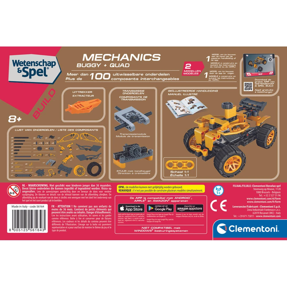 Bouw een buggy of quad met deze uitgebreide Clementoni buggy en quad bouwset. De kit bevat meer dan 100 onderdelen voor het bouwen van de twee verschillende, met transmissiemechanismen uitgeruste modellen. In de geïllustreerde handleiding wordt stap voor stap uitgelegd hoe je de buggy in elkaar zet. Veel speciale onderdelen zoals de transmissiemodule, versnellingen en nog veel meer maken de voertuigen gemakkelijker om mee te spelen. De app Science & Play Build integreert de speelervaring door een montagehulpmiddel te bieden voor alle modellen dankzij de interactieve 3D-animaties.