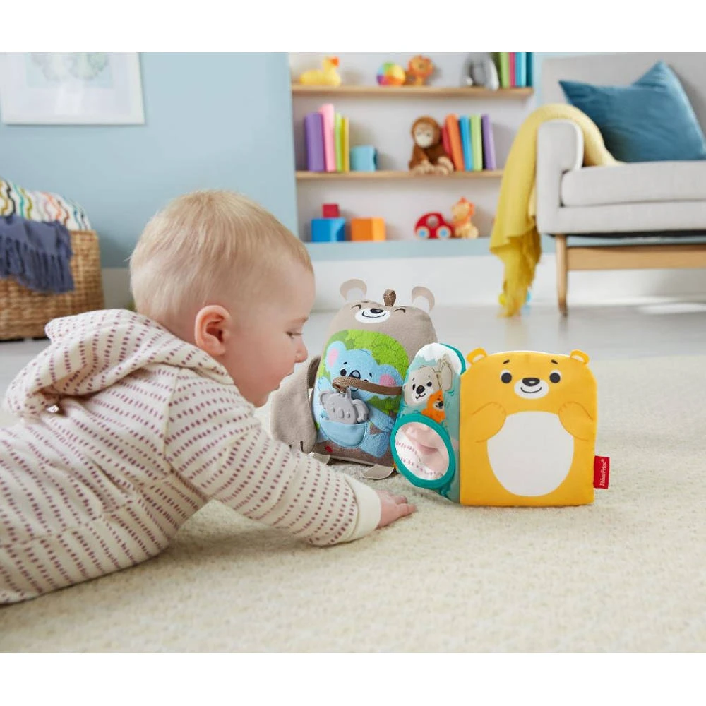 Er is veel te ontdekken met dit zachte Fisher-Price activiteitenboekje zoals een grote spiegel, een koalabijtring, een kreukelpaneel en meer.