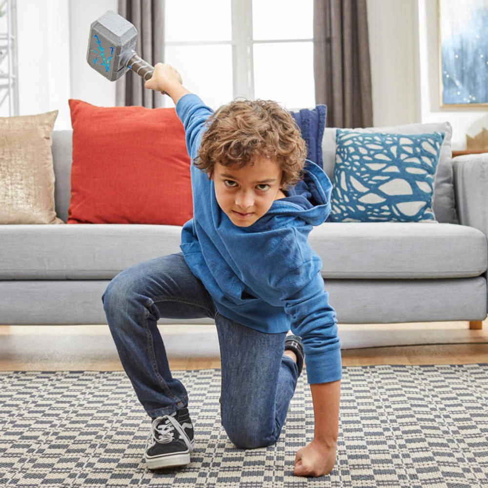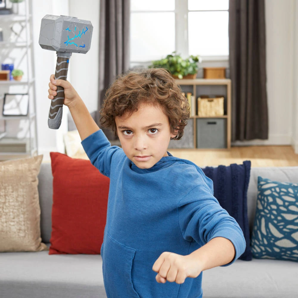 - Ga het gevecht aan en gebruik je Marvel Studios Thor: Love and Thunder Mighty FX Mjolnir elektronische hamer.