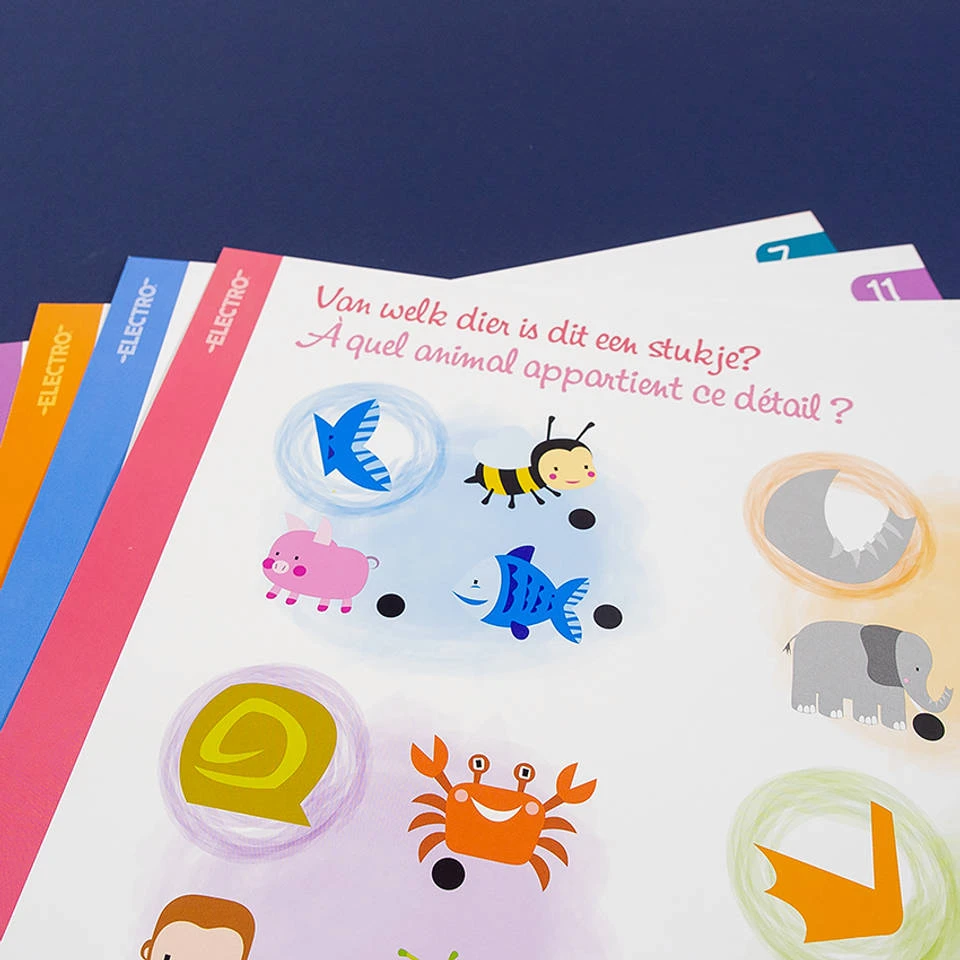 - De doos bevat twaalf grote kaarten met tekeningen en foto’s.