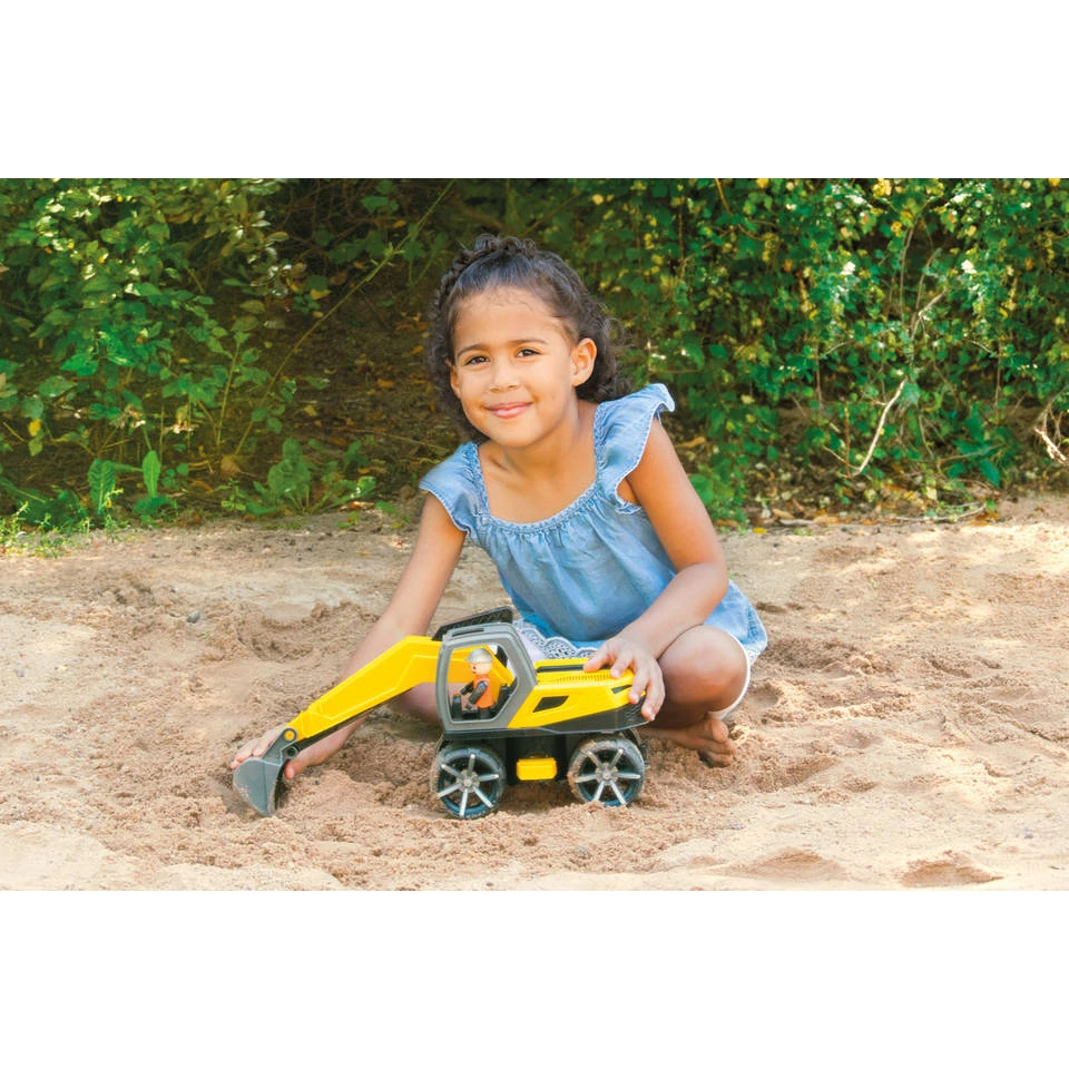 - Het speelgoedvoertuig beschikt over een beweegbare graafarm en actiefiguur, afsluitbaar chassis en een trailerkoppeling.