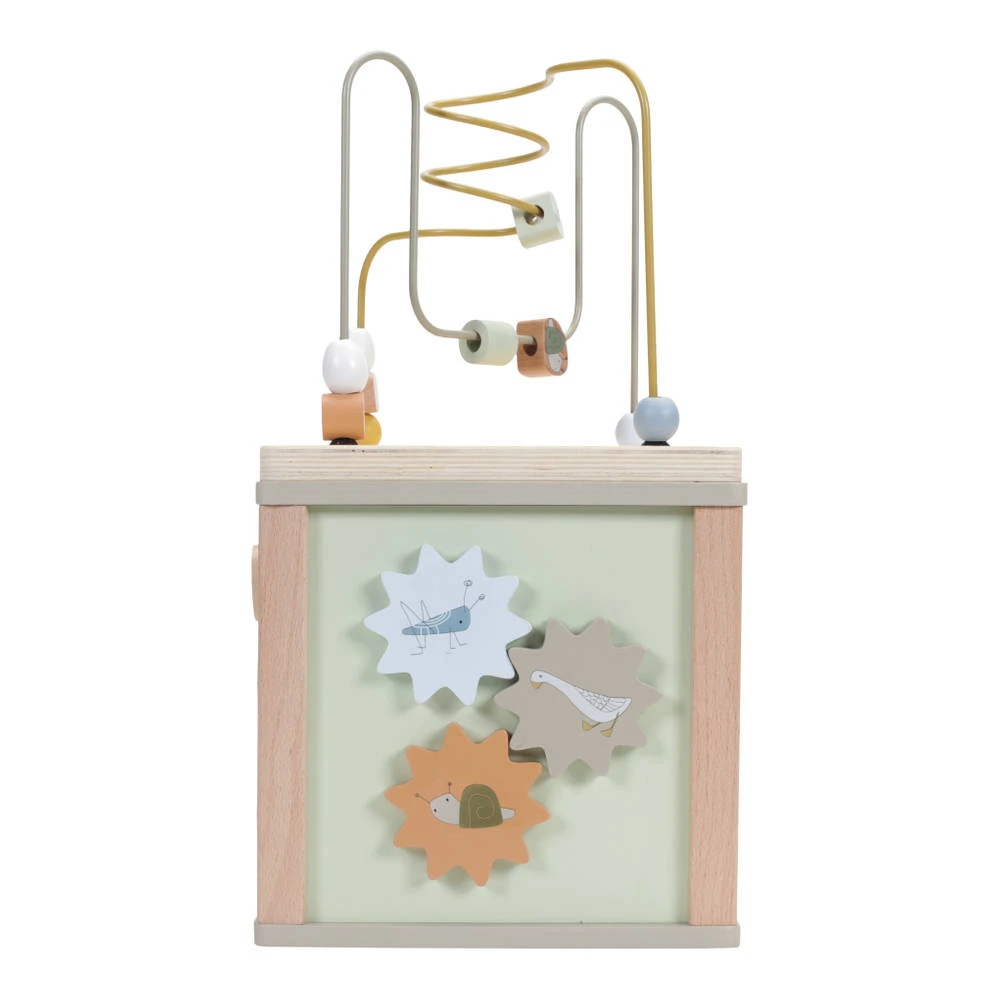 Deze Little Dutch Little Goose activiteitenkubus met een vormenstoof, draaiende tandwielen, puzzels en een leuke kralenspiraal is superleuk babyspeelgoed voor jouw kleintje.