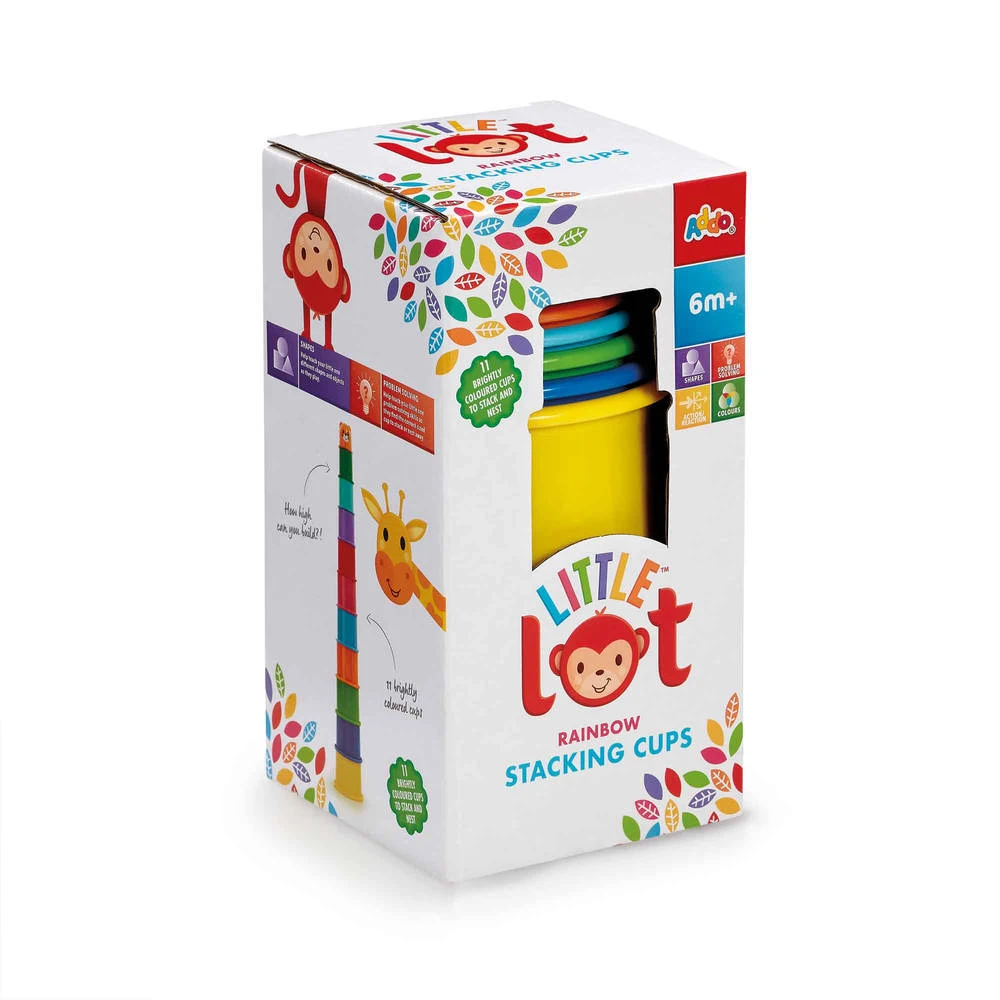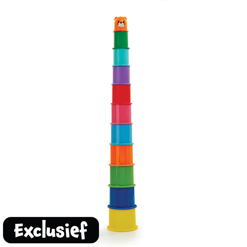 Deze regenboog stapelbekers van Little Lot zijn perfect voor divere spelletjes! Jouw kleintje kan ze onder meer gebruiken om te stapelen, tellen, vormpjes mee te maken in de zandbak of om water mee te scheppen tijdens het badderen. Er zitten elf felgekleurde bekers in de set, waarbij elke beker een andere vorm heeft en is voorzien van reliëfstempels op de bodem. Kijk toe hoe je kindje ontdekt hoe de bekers moeten worden gestapeld voordat ze weer omgegooid worden. Stapel de bekers hoog op en maak je toren compleet met de lachende tijgerkop die over je 68 cm lange pilaar waakt. De reliëfstempels op de bodem zijn ideaal voor het maken van patronen in het zand. Wat zie je? Een vliegtuig, auto, aap, telefoon, bloem of vierkant? Dit klassieke kleuterspeelgoed met regenboog leert kinderen verschillende kleuren en vormen te herkennen tijdens het spelen, waarbij tegelijkertijd de oog-handcoördinatie wordt ontwikkeld.