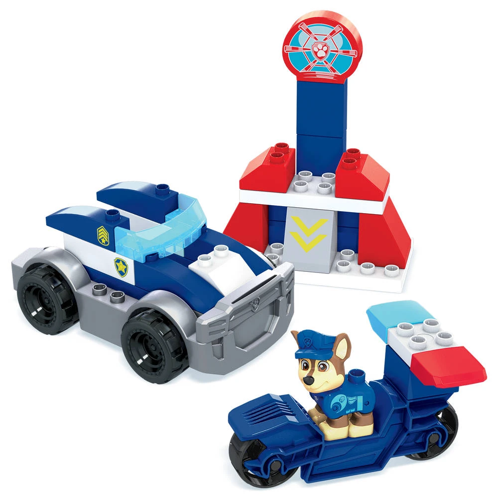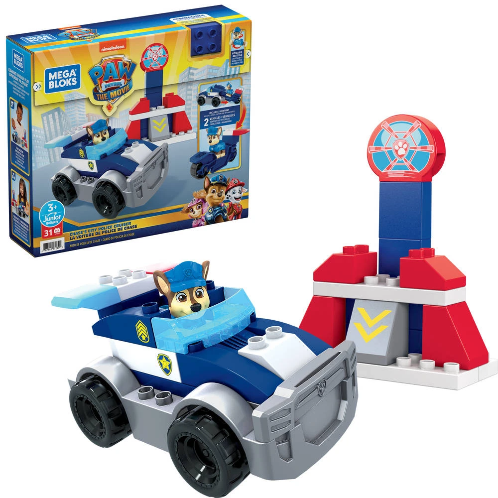 - Bouw met de verschillende onderdelen van deze Fisher-Price Mega Bloks PAW Patrol: De Film set de politieauto van Chase.