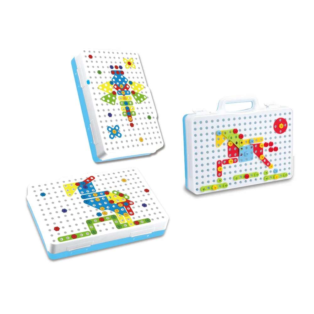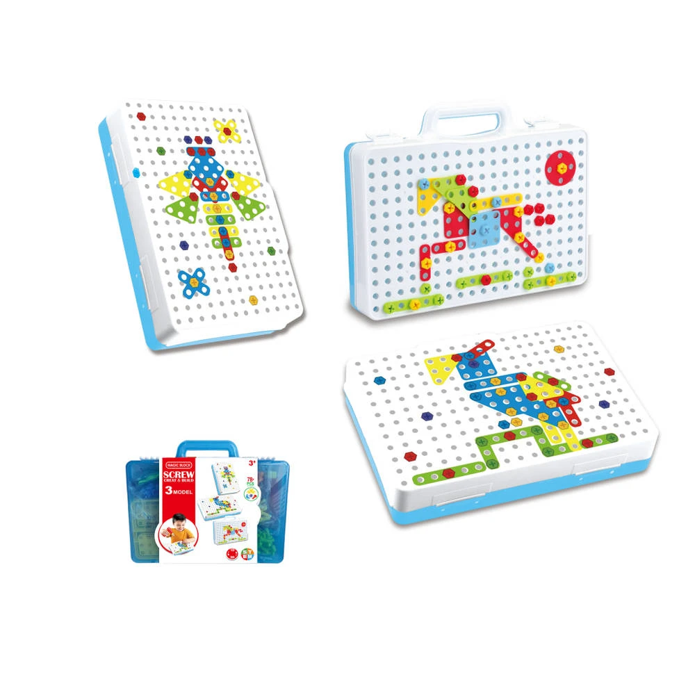 Kleine bouwvakkers kunnen deze elektrische boorblokkenkoffer op de bouwplaats goed gebruiken. In de koffer zitten een elektrische boormachine, 30 stuks schroeven en 48 blokken. Je hebt de schroeven in vijf kleuren, van elk zes stuks. De blokken heb je in vier vormen en vier kleuren.