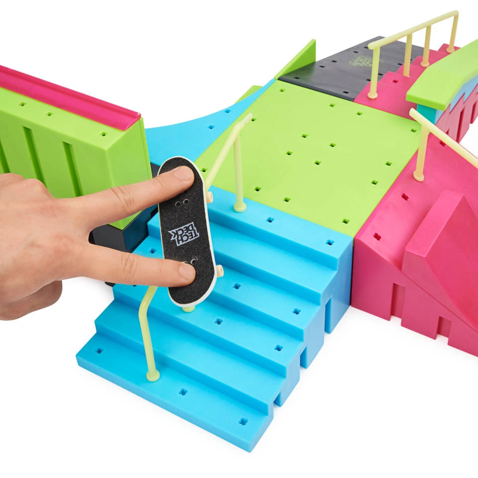 - Grind, glij, spring of ontwerp en wijzig je Neon Mega Park zoals je wilt. Gebruik de X-Connect Park Creator-schansen met je Tech Deck-vingerboardcollecties of Tech Deck BMX.