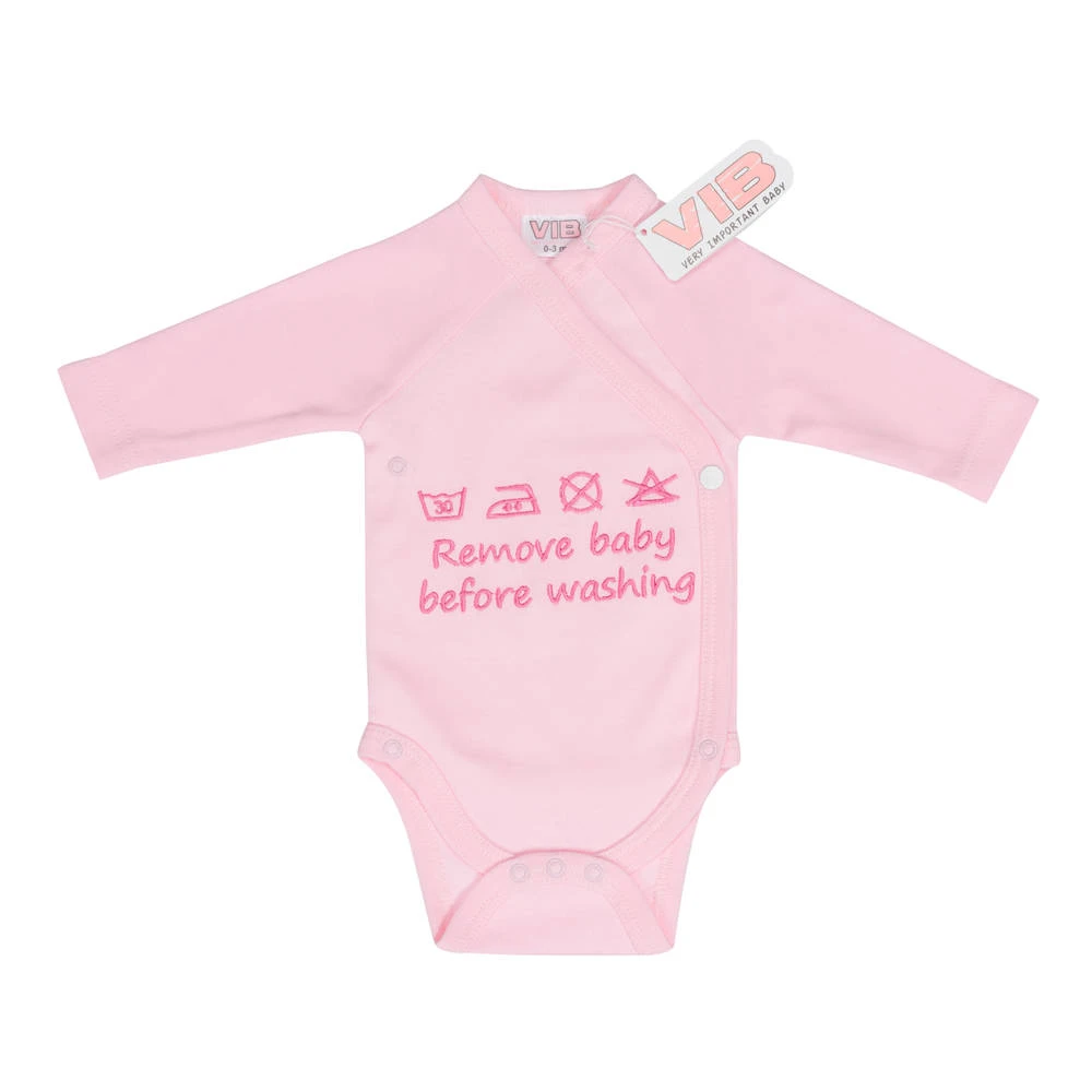 Op dit roze VIB remove baby before washing rompertje staat is een grappige tekst afgebeeld. Het rompertje is makkelijk aan en uit te trekken.