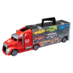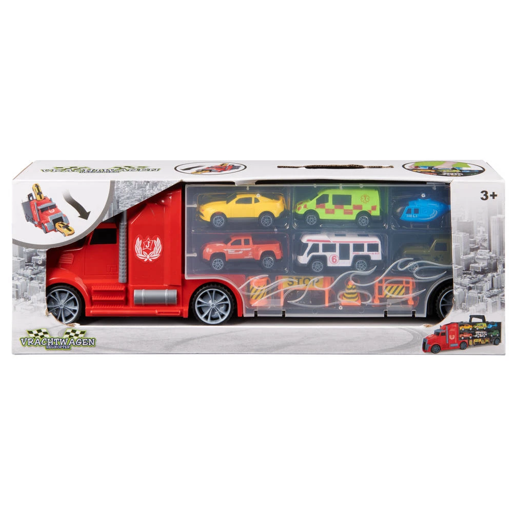- De set bevat een vrachtwagen, vijf auto’s en een helikopter.