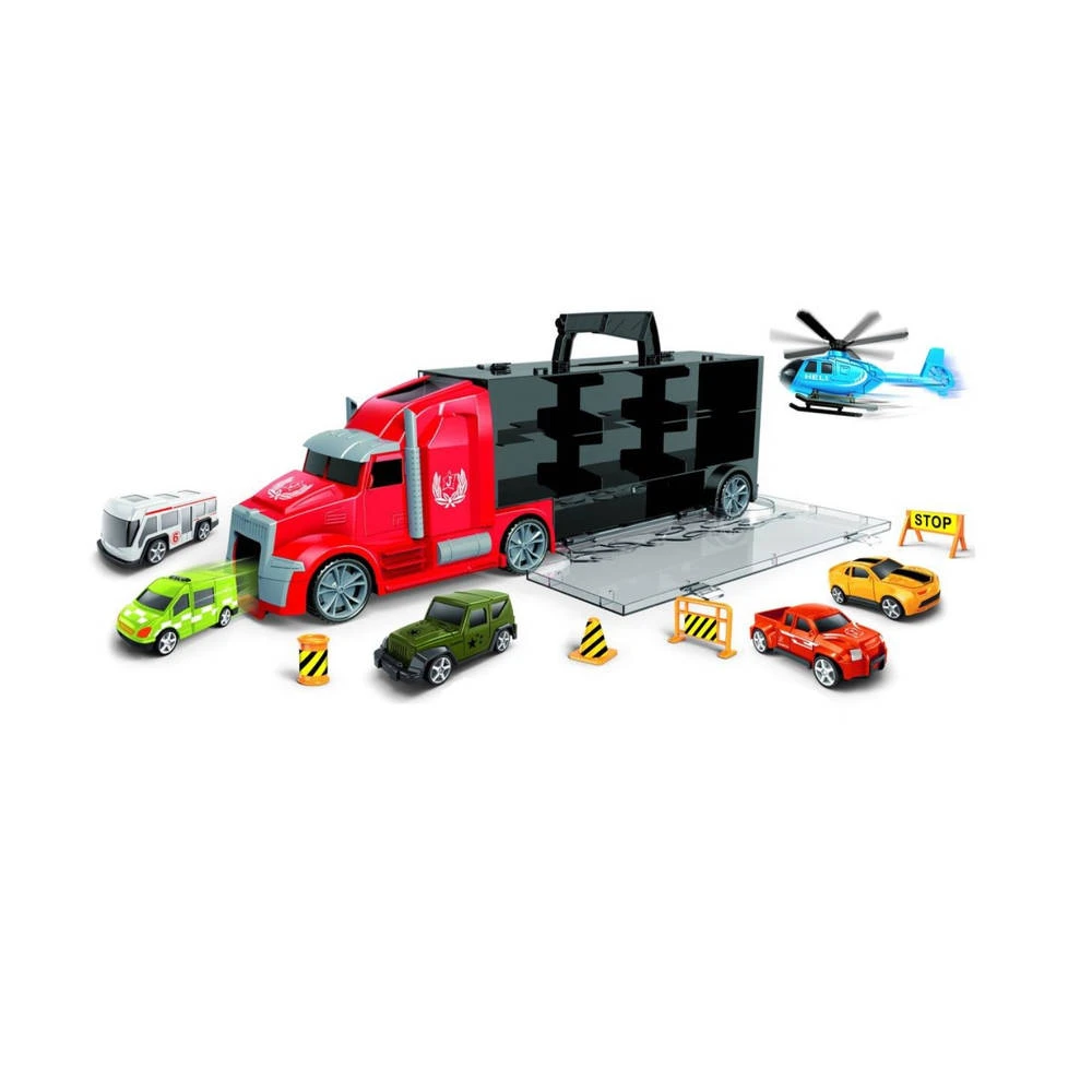 Deze set is leuk om mee te spelen maar ook heel leuk om te verzamelen. De set bevat een vrachtwagen, vijf auto’s en een helikopter. Met deze set kun je verschillende verhalen naspelen.