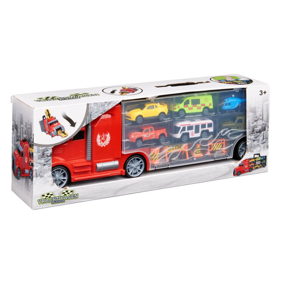 Met deze set heb je niet alleen een vrachtwagen, maar ook vijf superstoere auto’s en een gave helikopter..