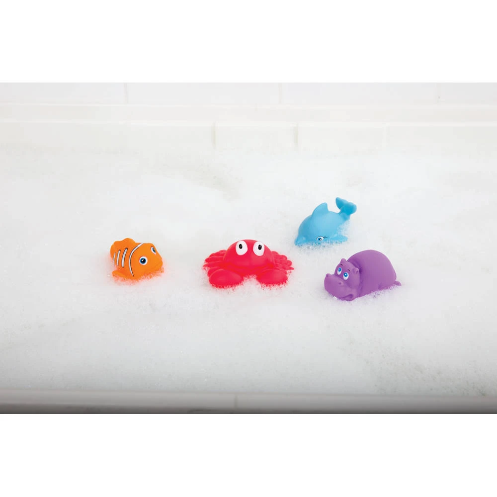 Ga lekker badderen met deze vier badspuitfiguren van Playgro. Deze waterdieren zorgen voor badplezier, vul ze met water en spuit het water eruit!