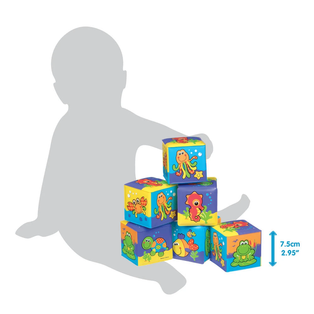 Vrolijke speelblokken om mee te spelen in bad of op de grond. De felle kleuren en verschillende diertjes stimuleren de visuele ontwikkeling.
