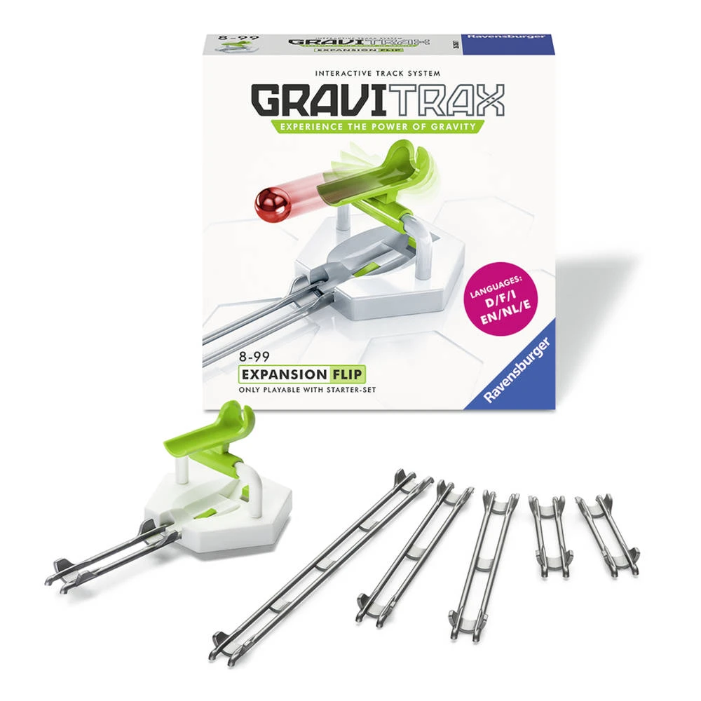 Breid je Gravitrax baan uit met de mini GraviTrax flip. Breng je kogel met de flip op spectaculaire wijze 180 graden naar boven en krijg nieuwe energie voor je track. Combineer de flip met de GraviTrax Starterset en zorg voor nog meer actie in je trajecten. Hoe ver komt je kogel met de flip?