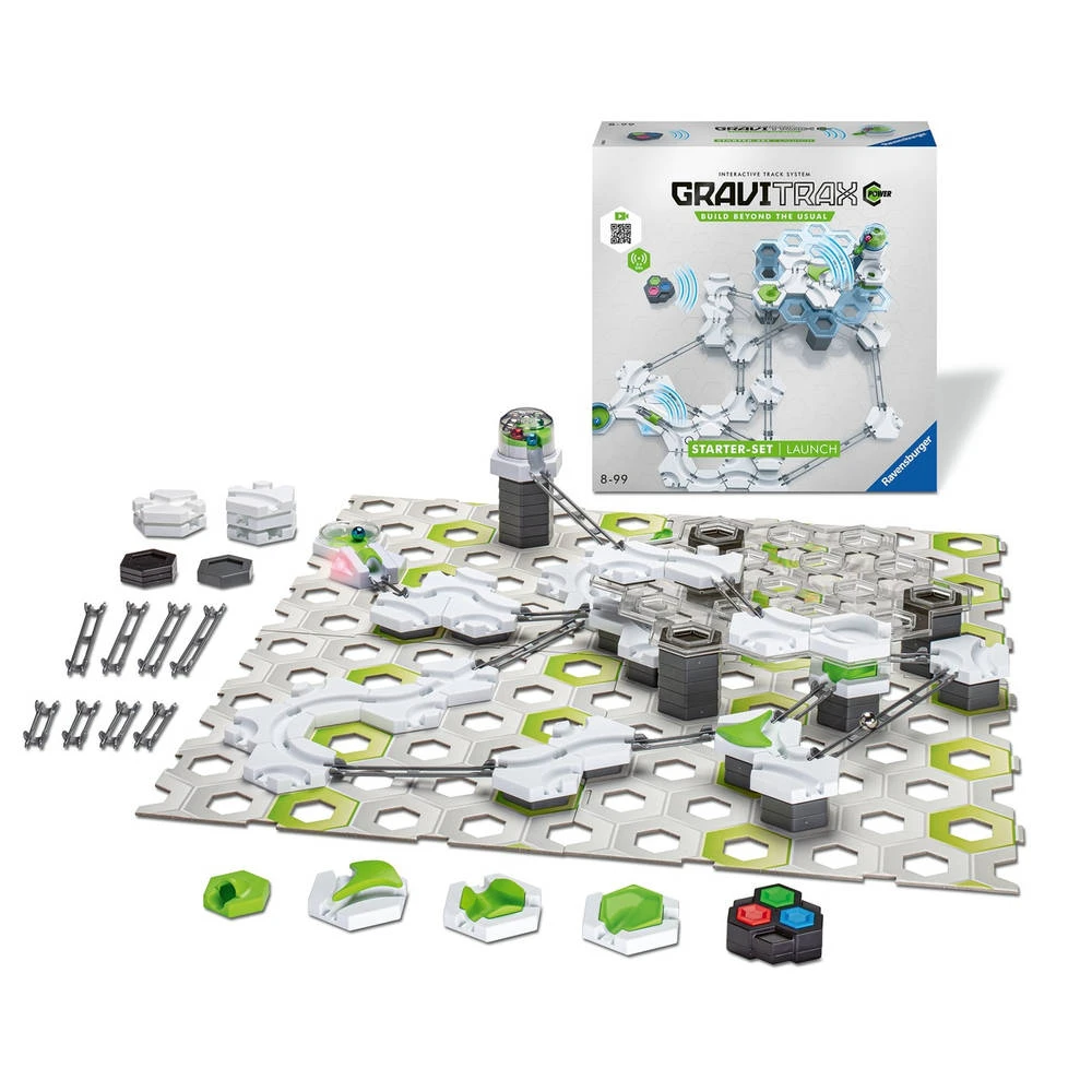 - Met de GraviTrax Power Launch starterset kun je aan de slag met een spannende kogelbaan.