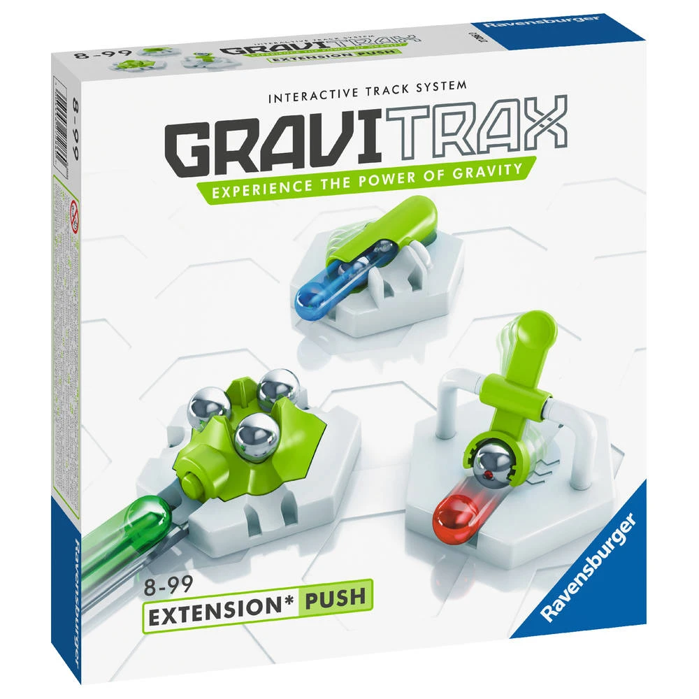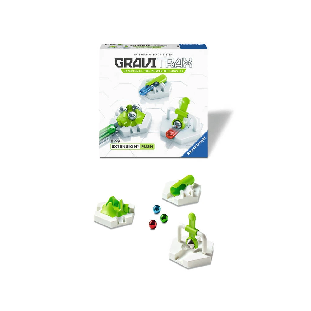 Kinderen beleven nog meer actie in hun individuele knikkerbanen met de GraviTax-uitbreiding Push. De drie populaire actiestenen Hammer, Vulcano en TipTube zitten allemaal in deze set. Gecombineerd met een starterset zorgt deze uitbreiding voor nog meer actie in de baan. Met de uitbreiding Push beleef je spelenderwijs hoe impulsen in de baan worden doorgegeven.