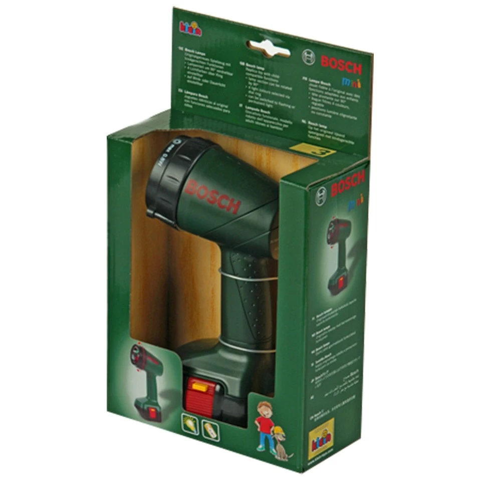 De speelgoed Bosch lamp op batterijen kan tot 90° draaien. Kies uit vier verschillende kleuren en laat het flitsen of constant licht geven. Verlicht de donkerste werkomgevingen met de Bosch speelgoed lamp van Theo Klein.