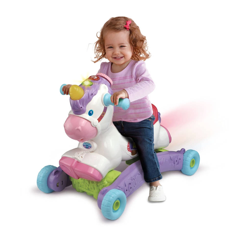 Druk op de toetsen en maak kennis met kleuren en vrolijke zinnetjes tijdens twee speelstanden n luister naar de grappige geluiden en gezongen liedjes. De eenhoorn is eenvoudig te transformeren naar een loopwagen voor nog meer speelplezier. En, twee, drie, voel de magie!