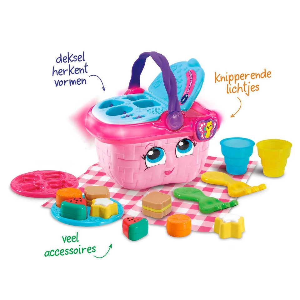 Ga lekker picknicken met deze VTech vormenpret picknickset. Open het deksel om vrolijke zinnetjes te horen en druk op de vlindertoets om vragen te horen of om naar vrolijke liedjes te luisteren. De deksel van deze picknickmand herkent de vormen, de set heeft knipperende lichtjes en vele accessoires. Berg alles weer netjes op na het picknicken! De kleurrijke vormgeving, vele accessoires en lieve stem stimuleren het spelen van rollenspellen en zorgen ervoor dat je helemaal klaar bent voor een smaakvolle picknick.