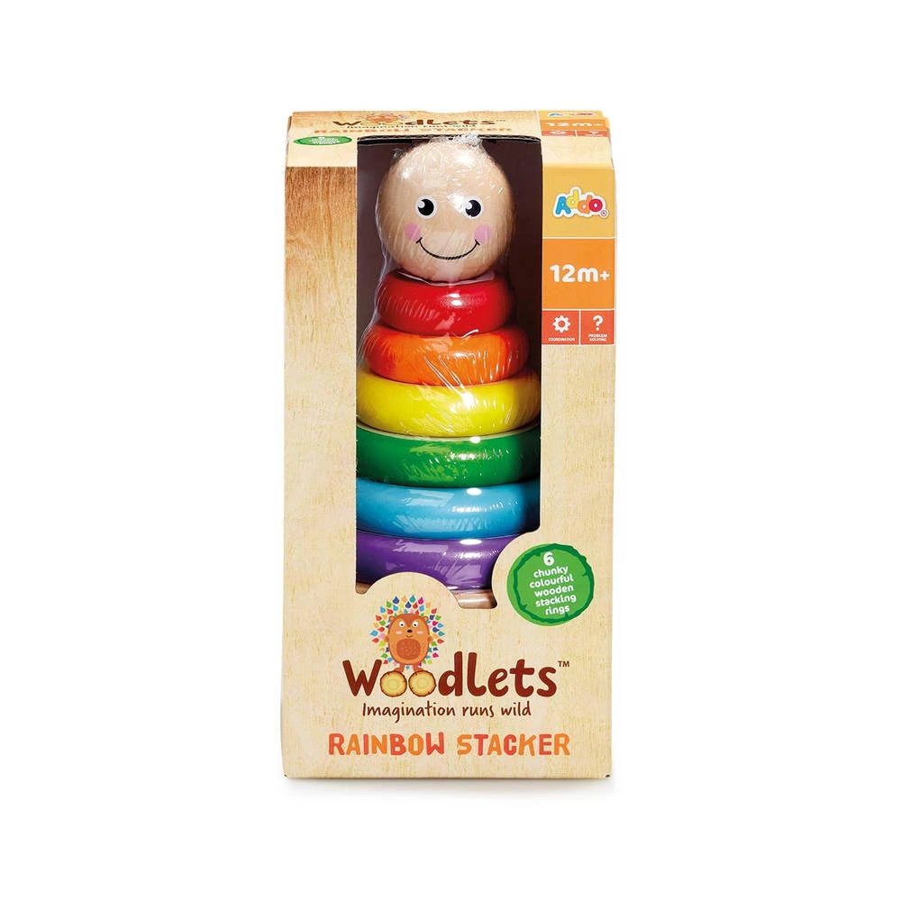 - De set bevat zes kleurrijke ringen, een houten sokkel en een smileyhoofd.